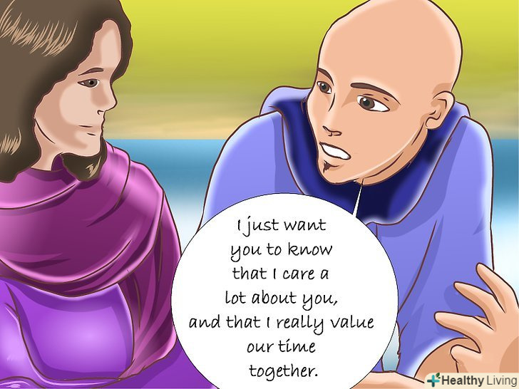 Зізнайтеся в своїх почуттях. незалежно від вашого ставлення до цієї дівчини, заявіть про свої почуття прямо — це найпростіший і найбільш відвертий спосіб дати зрозуміти, що вона вам небайдужа. Знайдіть час, коли ви залишитеся наодинці, і дочекайтеся відповідного моменту. Скажіть:"Я просто хочу, щоб ти знала: ти мені дуже подобаєшся, і мені подобається проводити з тобою час". Визнання має бути щирим і зворушливим. [3]- Якщо ви вже досить добре знайомі, то можете зізнатися коли завгодно, але якщо ви тільки починаєте ваші відносини, то краще почекати, поки підвернеться спокійний і романтичний момент. Розкажіть про свої почуття, коли будете сидіти на галявині, дивитися на зірки або прогулюватися разом довше декількох хвилин.