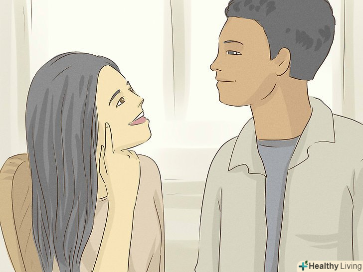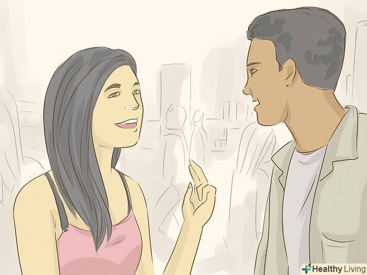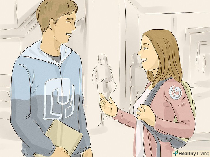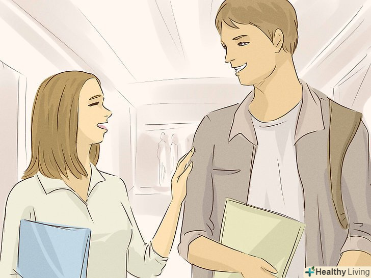 Встановіть зоровий контактІПосміхніться, затримайте погляд на 2-3 секунди. зоровий контакт продемонструє, що ви його помітили. Якщо ви посміхнетеся йому у відповідь, він зрозуміє, що цікавий вам. Крім того, посмішка автоматично робить ваше обличчя більш привабливим. Кожен раз, коли ви поруч з цим хлопцем, дивіться йому в очі і посміхайтеся. [4]- Не затримуйте погляд довше трьох секунд, інакше хлопець відчує себе некомфортно.