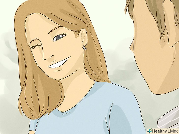 Коли будете проходити повз, можна злегка підморгнути йому. підморгування-дуже хороший і простий спосіб флірту, вам навіть не знадобиться нічого говорити. Просто кожен раз, коли будете проходити повз нього, погляньте на нього, посміхніться і підморгніть. Зробіть так, щоб хлопцеві довелося подумати, що ж означає ваше підморгування. В якості альтернативи можна підморгнути хлопцеві прямо під час розмови — це теж милий елемент флірту. [6]- Якщо з якоїсь причини такий флірт не справив на нього належного враження, просто зробіть вигляд, що це була чиста випадковість. Скажіть: "о, вибач! Здається, мені щось потрапило в око! Мені терміново потрібне дзеркало!»