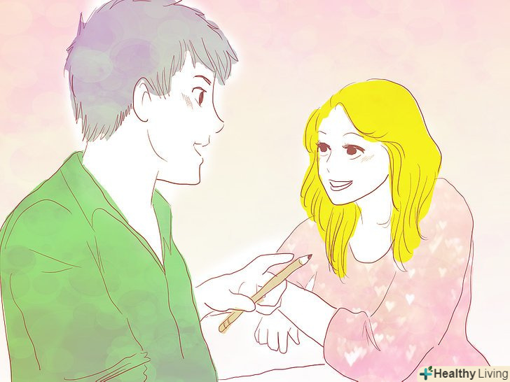 Почніть розмову: це набагато простіше, ніж ви думаєте. Навіть якщо це проста фраза «чи можна взяти твій олівець?"Це може послужити гарною можливістю. Якщо він відповість «о, Будь ласка", мило посміхніться йому. Це покаже, що в подальшому, мова не повинна йти про шкільні предмети. Підказка: дослідження показують, що коли ви звертаєтеся до хлопця, звертайтеся по імені, Це покаже, що він вам цікавий, так що перефразуйте " чи можна взяти твій олівець?«на " чи можна взяти твій олівець, Джо?»