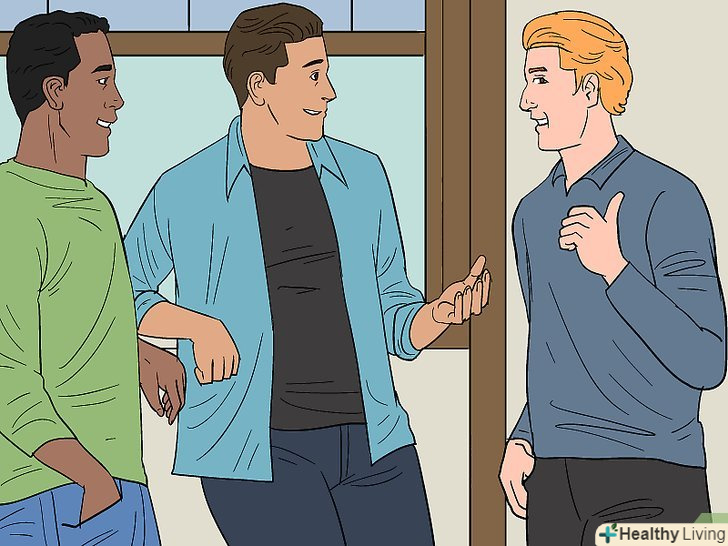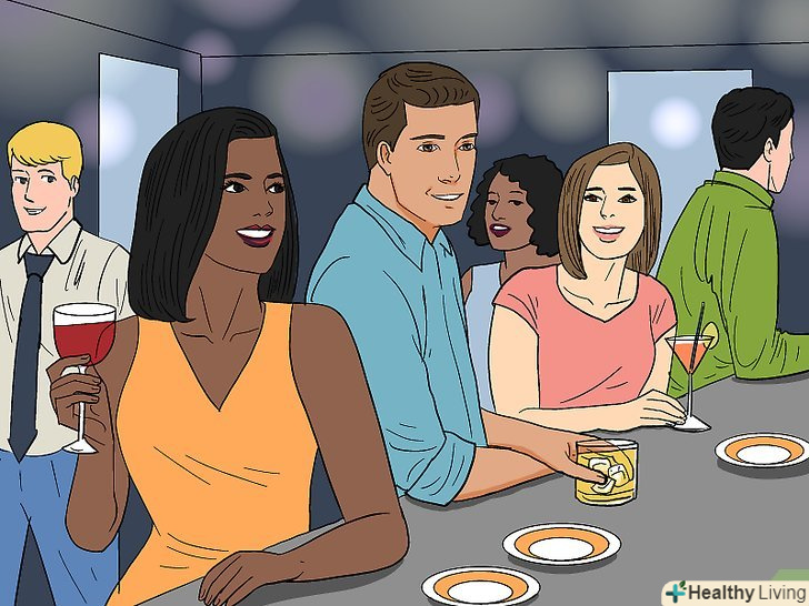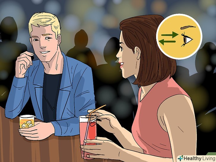Встановіть зоровий контакт. виберіть дівчину, яка вам цікава, і встановіть з нею швидкоплинний зоровий контакт. Не потрібно витріщатися і витріщатися. Час від часу поглядайте на дівчину і посміхайтеся. Якщо вона буде дивитися на вас і посміхатися у відповідь, у вас напевно є шанси. [2]- Також залучайте відкриту мову тіла, щоб показати свій інтерес. Руки слід розслабити і опустити уздовж тіла або недбало тримати келих з напоєм, голову і тіло — повернути в бік дівчини.