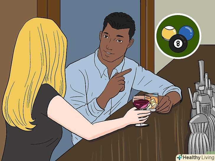 Запропонуйте пограти в більярд або дартс. Запропонуйте зайнятися разом чимось захоплюючим на зразок партії в більярд або дартс. Якщо в барі є ігрові автомати, Запропонуйте позмагатися. Така розвага допоможе вам підтримати розмову, розслабитися і насолоджуватися компанією один одного. [5]- Можливо, дівчина захоче просто розмовляти з вами і насолоджуватися напоями, а не грати в більярд. Ще можна запропонувати веселу алкогольну гру разом з вашими друзями і друзями дівчини. Це відмінний спосіб знайти спільну мову і весело провести час всією компанією.