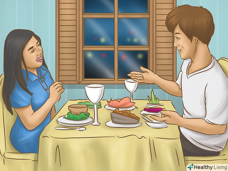 Будьте уважним під час розмови. найголовніше, що ви можете зробити на першому побаченні, — щиро брати участь в розмові і проявляти інтерес до того, що розповідає дівчина. Уважно слухайте, коли вона говорить. Посміхайтеся і задавайте питання, щоб показати, що ви її слухаєте. Якщо ви не зовсім розумієте, про що йде мова, попросіть її роз'яснити. Поділіться власним досвідом, який пов'язаний з тим, про що вона вам розповіла. Людям подобається, коли їх слухають і розуміють. [5]- Під час бесіди дуже важливий візуальний контакт, тому дивіться їй в очі, коли вона розмовляє. Але якщо вам некомфортно підтримувати зоровий контакт протягом тривалого періоду (як і більшості людей), спробуйте зосередитися на точці між очей.