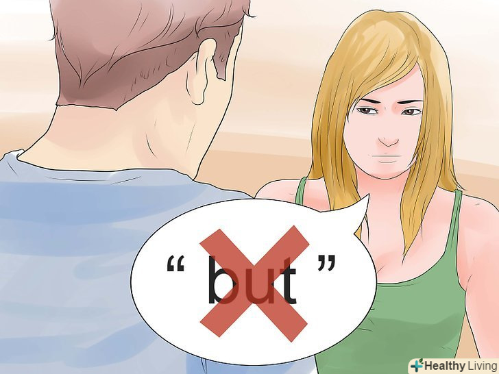 Уникайте всіх "але". може бути дуже спокусливо спочатку вибачитися, а потім продовжити запереченням : "мені дуже шкода, що я образив тебе, але ти дійсно мав на увазі це". Це але може звести ваші вибачення нанівець. Вибачайтеся і висловлюйте ваші почуття окремо. [11]