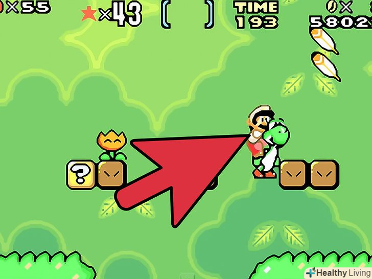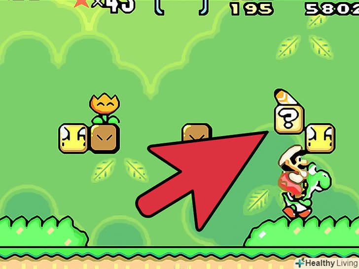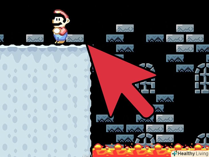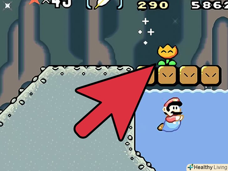 Візьміть кілька корисних предметів.Розбийте обертові блоки, щоб взяти перо, Вогненна квітка і додаткове життя. Будьте обережні, коли берете ці предмети, - не зваліться в гарячу лаву!