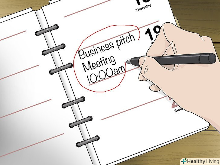 Запишіть час, який ви виберете для зустрічі. як тільки ви визначитеся, на який час перенести зустріч, внесіть його в свій щоденник або свій розклад. Можна також написати фізичну замітку-нагадування і помістити її на чільне місце. [10]