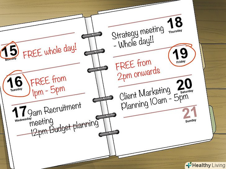 Перерахуйте кілька часових інтервалів, коли ви можете зустрітися. зробіть все можливе, щоб підлаштуватися під розклад іншої людини, проте надайте йому кілька варіантів на вибір. Виділіть 3-4 вільних проміжку в своєму розкладі і запитайте, чи зручно буде людині зустрітися в цей час. [7]- Наприклад, можна сказати: "я вільний в п'ятницю після 14:00, в будь-який час в понеділок або у вівторок між 13 і 15 годинами дня. Чи підходить вам який-небудь з цих варіантів, або вам зручніше зустрітися в інший час?»