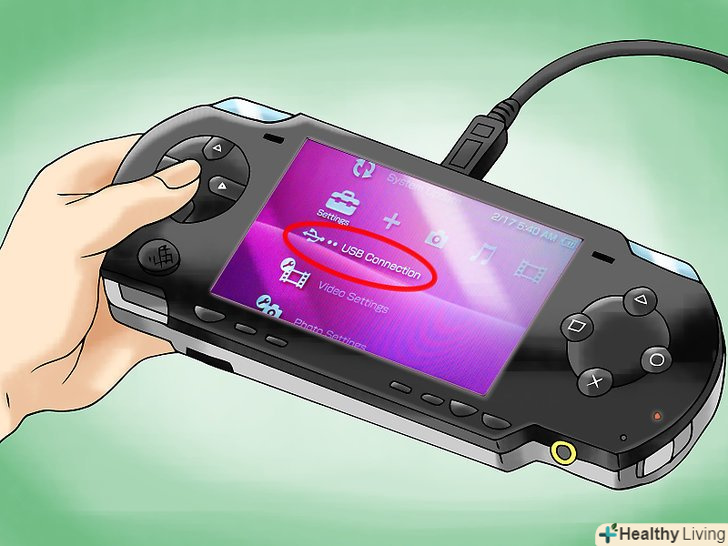 Підключіть кабель Mini-B (5 контактний) в роз'єм PSP.[1] це такий же кабель, яким ви підключаєте геймпади для PlayStation 3, але з PSP повинен йти окремий такий кабель.- Роз'єм для кабелю Mini USB для моделей PSP 1000-3000 знаходиться у верхній частині консолі.