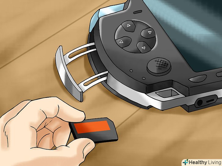 Вийміть карту пам'яті з консолі.карта пам'яті знаходиться в роз'ємі в нижньому лівому кутку PSP.- Відкрийте роз'єм нігтем або плоским предметом (наприклад, монетою), щоб схопитися за щілину в кришці роз'єму, і потягніть за неї.