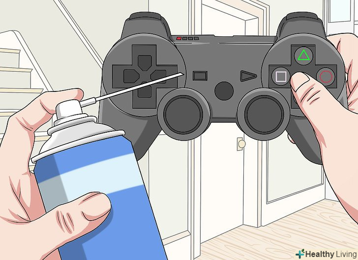 Продуйте джойстики стисненим повітрям.для початку приберіть якомога більше пилу стисненим повітрям. Особливу увагу приділіть виїмкам між корпусом джойстика і кожною кнопкою, сенсорною панеллю і аналоговими важелями, а також іншим щілинах, через які пил міг потрапити всередину джойстика.[10]