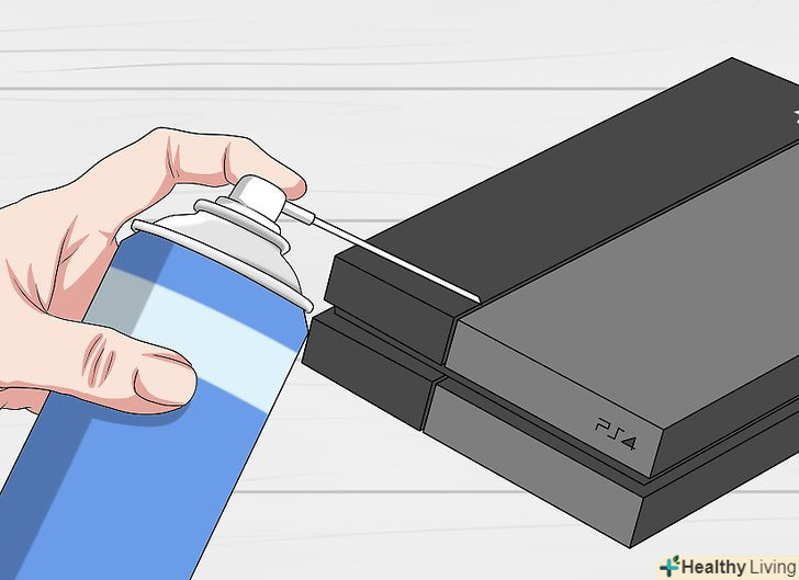 Здуйте пил.почніть продувати короткими залпами уздовж виїмки, яка знаходиться посередині консолі. Потім перейдіть до роз'ємів, які розташовані спереду і ззаду. І нарешті, здуйте якомога більше пилу з решти поверхні і не забудьте продути вентиляційні отвори.[4]