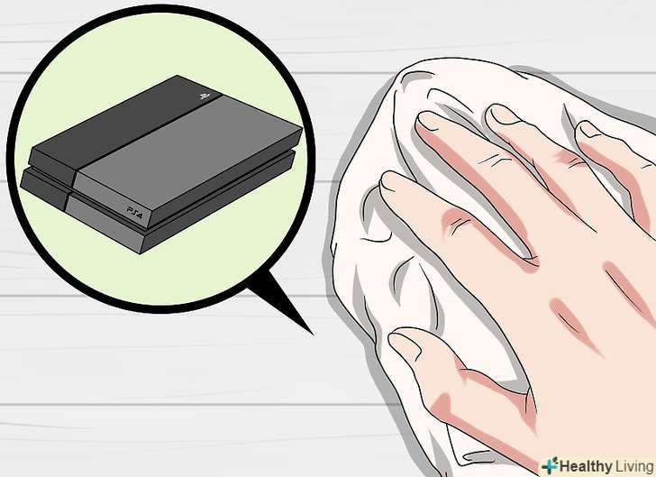 Протріть консоль сухою тканиною з мікрофібри.решту пилу обов'язково витирайте чистою сухою тканиною, оскільки мокра ганчірка може нашкодити консолі.[5] гарненько протріть всі зовнішні частини консолі одним поздовжнім рухом, починаючи від світлового індикатора, щоб в нього не потрапила пил. Подбайте про те, щоб пил не потрапила в порти, інакше всі зусилля будуть витрачені даремно.[6]