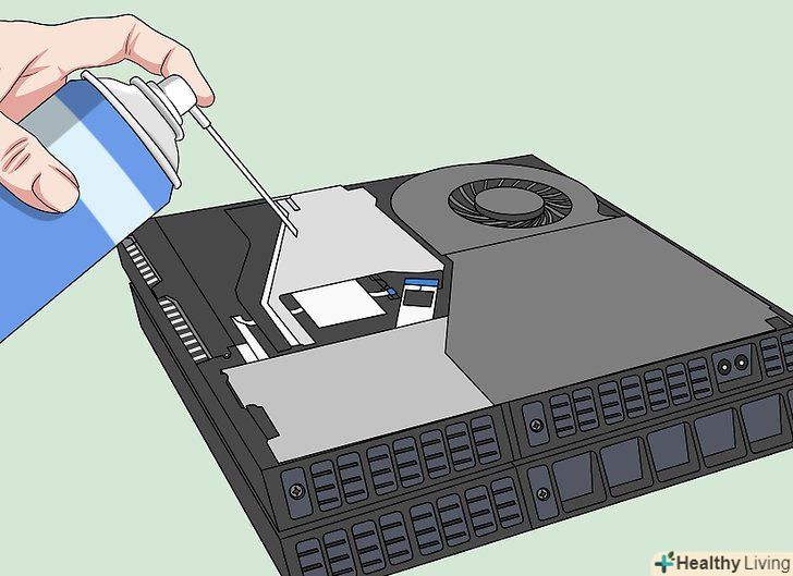Стисненим повітрям продуйте вентилятор і інші частини консолі.тепер, коли ви дісталися до внутрішніх частин консолі, дуже обережно продуйте їх стисненим повітрям, щоб не розприскати вологу. Тримайте балончик вертикально і як мінімум в 13-15 см від вентилятора. Найбільше пилу накопичується на вентиляторі, так що почніть з нього.- Продуйте стисненим повітрям всі ділянки з пилом, крім дисковода, - таким способом останній можна пошкодити.