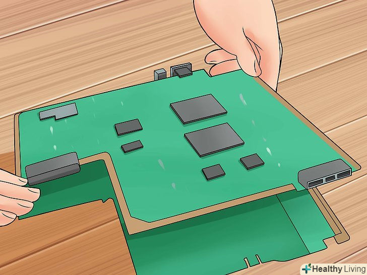 Вийміть материнську плату.по краях металевої пластини повинно залишатися ще сім гвинтів. Відкрутіть їх, щоб у вас була можливість вийняти материнську плату з корпусу. Після видалення гвинтів дістаньте материнську плату разом із задньою панеллю.- Візьміться за вентиляційні отвори і виймайте її під кутом обома руками. Намагайтеся не впустити плату, щоб уникнути пошкоджень.