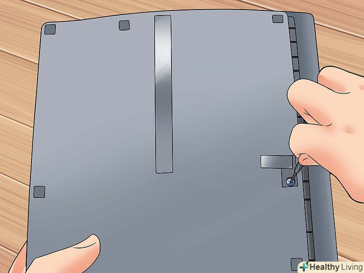 Вийміть жорсткий диск.перед відкриттям корпусу Вам буде потрібно демонтувати жорсткий диск. На щастя, у випадку PS3 це досить просто зробити. Видаліть кришку жорсткого диска з лівого боку PS3. Вам потрібно видалити синій гвинт, будьте обережні з його різьбленням, її дуже легко зірвати. Після цього витягніть жорсткий диск.- Там же, видаліть наклейку з верхньої частини корпусу, щоб відкрити гвинт-торкс. Вам буде потрібно відповідна викрутка (зіркоподібна) для такого типу гвинтів.