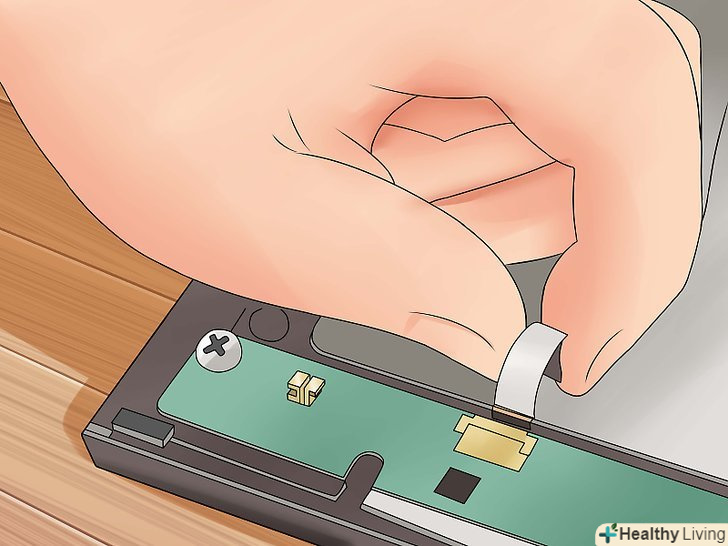 Знайдіть блокуючі замки.всього має бути два замки, які блокують каркас. Вони повинні знаходитися на задній стороні. Натисніть на них одночасно і акуратно підніміть каркас. Будьте обережні, верхня частина з'єднана з обладнанням нижньої частини шлейфами. Ці шлейфи дуже неміцні.- Акуратно від'єднайте шлейф і відкладіть його в сторону.
