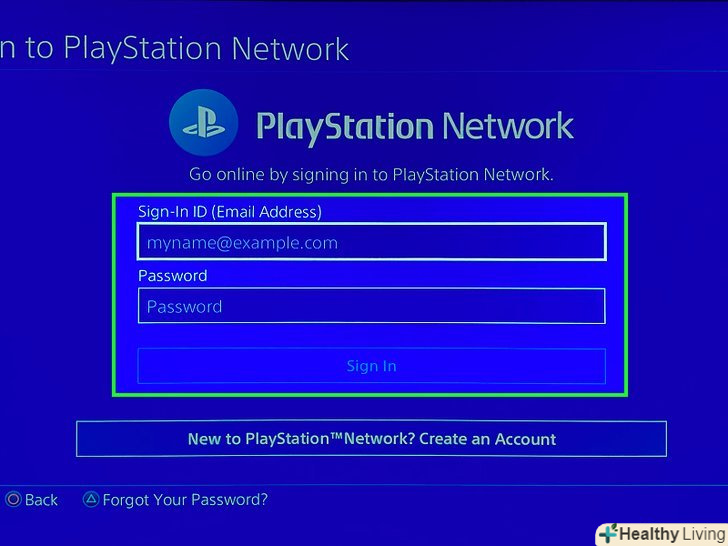 Виберіть Sign In/Увійти, а потім введіть свої облікові дані для входу в PSN. щоб отримати можливість завантажувати безкоштовні і Платні ігри, вам спочатку потрібно зареєструватися. Якщо у вас ще немає облікового запису в PSN, дотримуйтесь цієї Інструкції , щоб зареєструватися. [1]