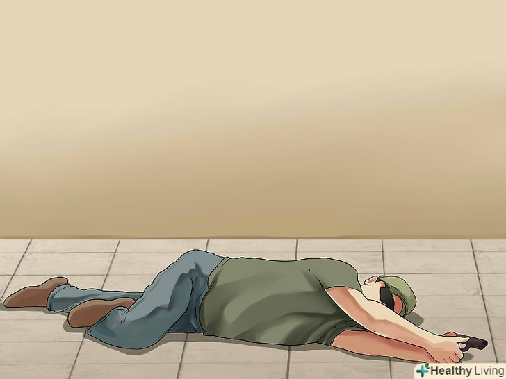 Лежачи : Вам потрібно потренуватися лежати на землі. Ви зрозумієте, що вирівнювати цілик і мушку стане складніше, як і контроль побіжного вогню. Ваше положення на землі має бути наступним: ляжте на живіт. Потім злегка перекотіться на сторону, з якої Ви будете стріляти. Покладіть недомінантну ногу і лікоть на землю. Place your support knee and elbow down on the ground. Ваше тіло при цьому буде трохи викривлено, але рука з пістолетом буде рівною, а ваша голова буде на ній, і ви буде дивитися через приціл. Так забезпечується вільне дихання і велика стійкість.