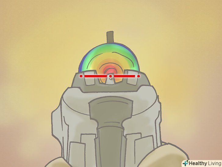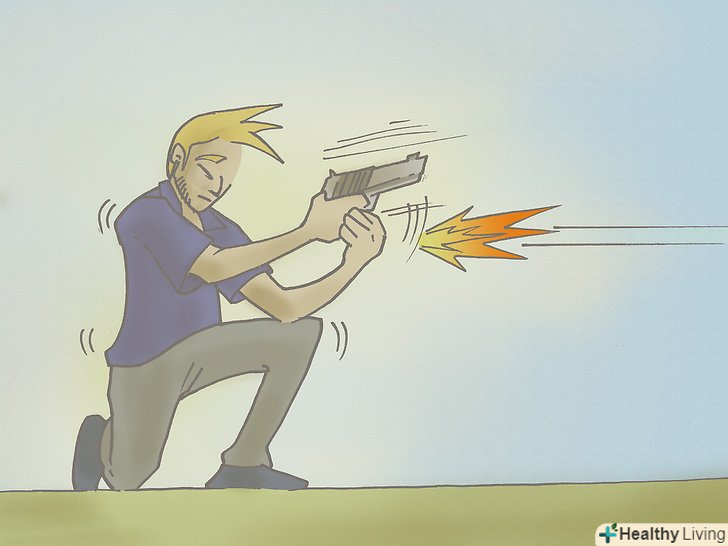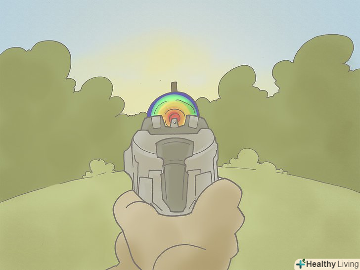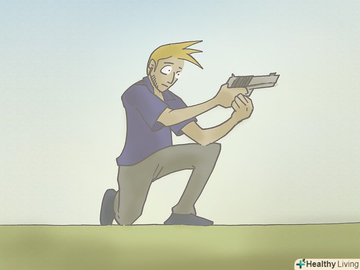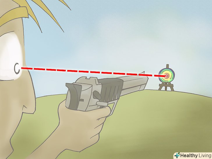 Злегка нахиліть голову вправо, щоб приціл пістолета знаходився на одній лінії з правим оком. можливо, вам буде потрібно посунути праве зап'ястя, щоб приціл був спрямований прямо вперед. Щоб прицілитися, рухайте тіло (зберігаючи позицію) до тих пір, поки зброя не буде націлена на мішень.