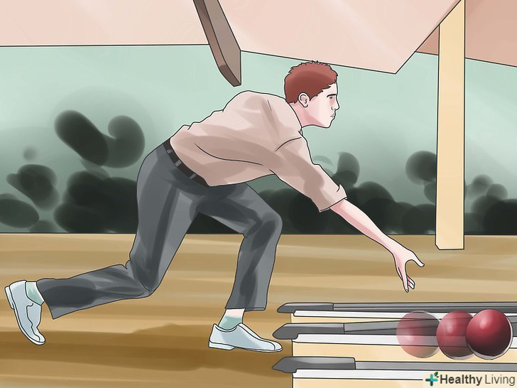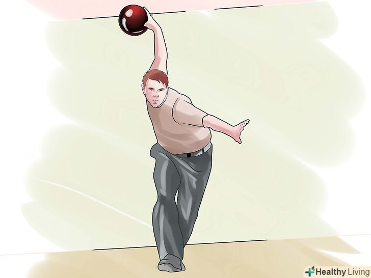 Доводьте до кінця. однаково важливо і рухатися вільно і доводити рух руки до кінця після того, як відпустили кулю. Після того, як відпустіть кулю, важливо продовжувати рух рукою вперед в напрямку доріжки, а не вгору. Ваші пальці самі створять висхідний підйом, вам не доведеться піднімати кулю вгору.- Хороший спосіб запам'ятати – це стара реклама ESPN: «Котіть м'яч, а потім відповідайте на телефонні дзвінки». Хоча, сподіваюся, ви перебуваєте в кращій формі, ніж хлопець з цієї реклами. І запам'ятайте, плавність тут дуже важлива: не трясіть рукою, робіть невелику паузу і потім доводите дію до кінця – все це повинно бути одним плавним рухом. Добре виконане фінальне рух має вирішальне значення для постійної швидкості м'яча і точності кидка.