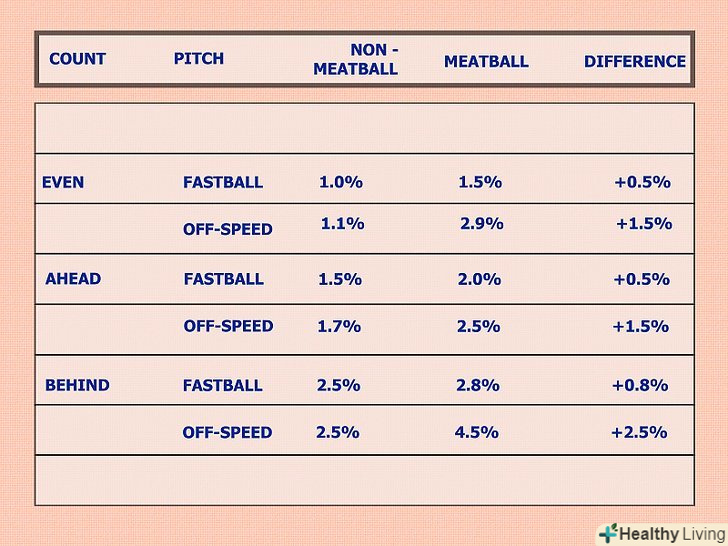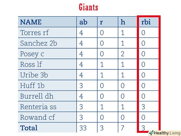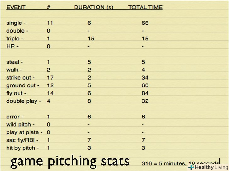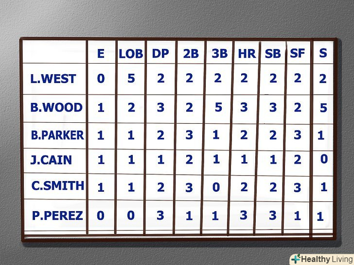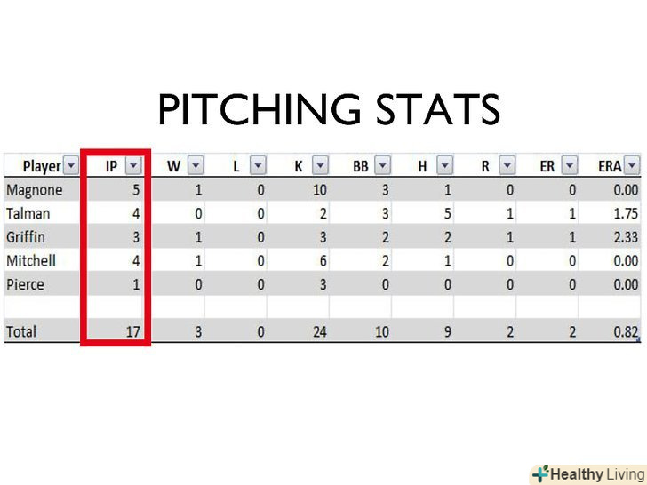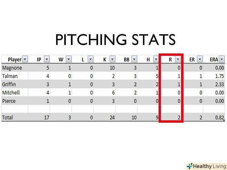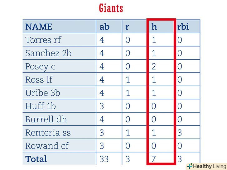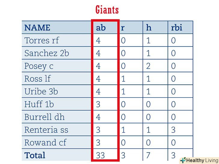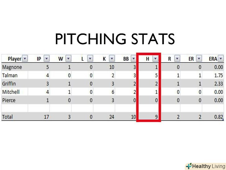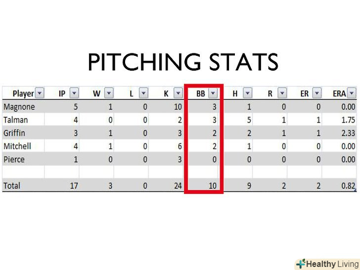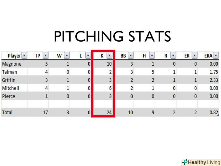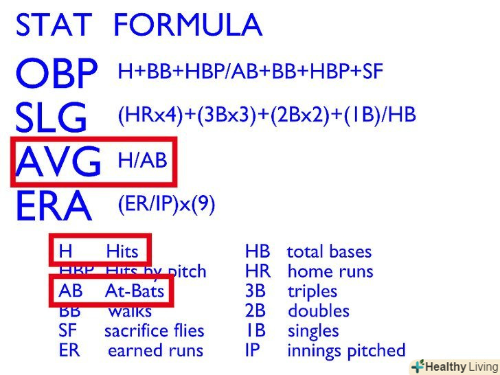 - Avg.: Розділіть кількість ударів на кількість виходів гравця до біти щоб обчислити середнє, яке буде є середньою кількістю подач гравця.