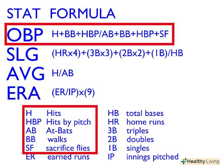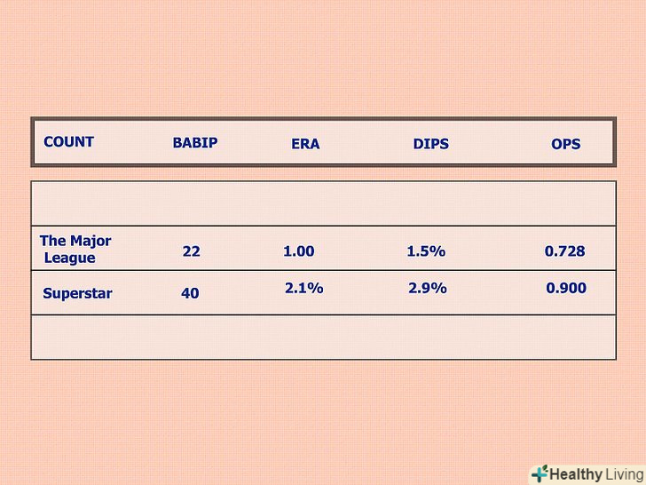 Досліджуємо інші статистичні додатки. за останні десятиліття виникло безліч різних методів статистичного аналізу в бейсболі. Лише деякі, а саме Саберметрікс зробили революцію в самому процесі оцінювання талантів бейсболу. У той час як багато установок Саберметрікс отримали широке визнання серед шанувальників і аналітиків, дві, зазначені нижче, відзначилися.- OPS: на базі + Слаггинг. Білл Джеймс, творець Саберметрікс, шукав просту, визначальну статистику, яка б вимірювала здатність гравця приносити очки команді. Після складання кількостей OPS, виходячи з гри сотні гравців протягом багатьох років, нарешті ефективність проекту визначення цінності гравця для його команди була затверджена. В середньому OPS Вищої ліги становить 0.728. У суперзірки така величина дорівнює 0.900.