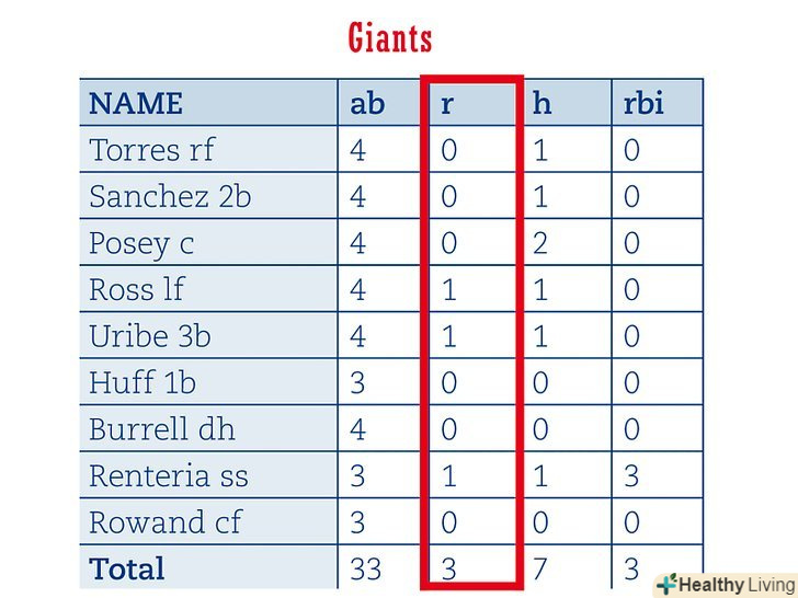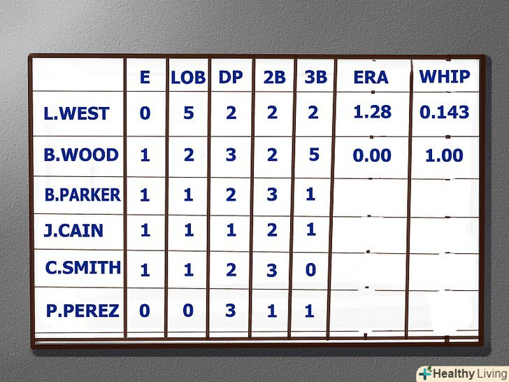 Вивчимо переміщення гравця по полю і інформацію про подачі по таблиці нападів більш детально. персональні досягнення виділяються в цьому розділі. Наприклад, якщо гравець на ім'я Сміт здійснив свій шостий хоум ран за сезон, в рейтингу буде зазначено, HR: Сміт (6). Інші статистичні категорії в цьому розділі в Таблиці показників включать в себе:- E: помилки, LOB: знаходження на базі (командна статистика), і DP: подвійна подача (командна статистика).