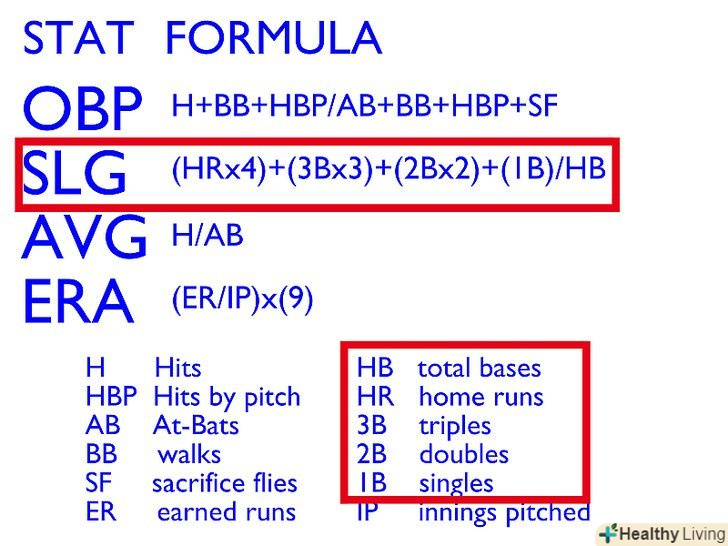 - Slg.: Для того щоб дізнатися відсоток складу гравця, розділіть суму його досягнень бази на суму виходів до біти. Сумою баз є сума Хоум ранів гравця х 4, тріплс х 3, даблс х 2, і сингл.