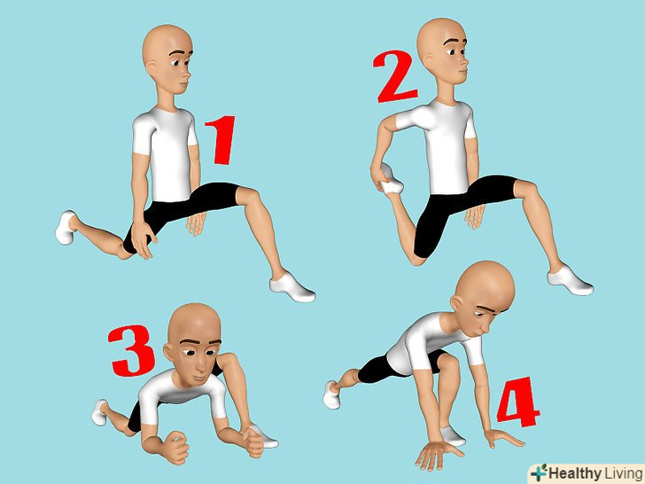 - Поверніться у вихідне положення. Потім відірвіть коліно задньої ноги від підлоги і розтягуйтеся в досягнутому випаді. Після цього повторіть дану комбінацію вправ на іншу ногу.