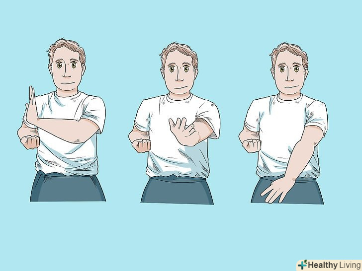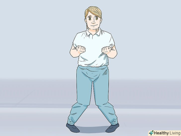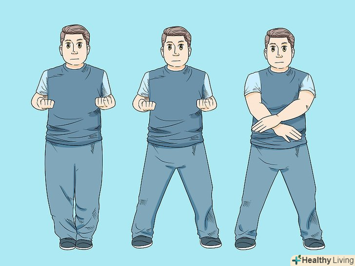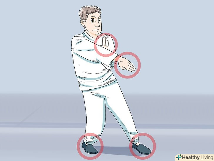 Освойте Гонг Лик. Гонг Лік є першим розділом Сіу Нім Тао і зосереджений на хорошій організації та релаксації. Ви навчитеся робити відкриту стійку, при якій особа звернена до супротивника. Працюйте над тим, щоб тіло залишалося розслабленим.- Практикуйтеся в стійці Джі Кім Юнг Ма або відкритій стійці. У цій стійці потрібно стати обличчям вперед. Стопи розгорніть трохи назовні. Зігніть коліна. Вага повинна рівномірно розподілитися на обидві ноги. Для того щоб освоїти руху рук і кистей, зосередьтеся на положенні рук і ліктів. Така фронтальна стійка дасть вам найбільшу перевагу в бою, наприклад, за допомогою рук і ніг ви зможете захищати свою центральну лінію. Краще користуватися в рівній мірі обома сторонами тіла, ніж віддавати перевагу якійсь одній стороні тіла. [7]