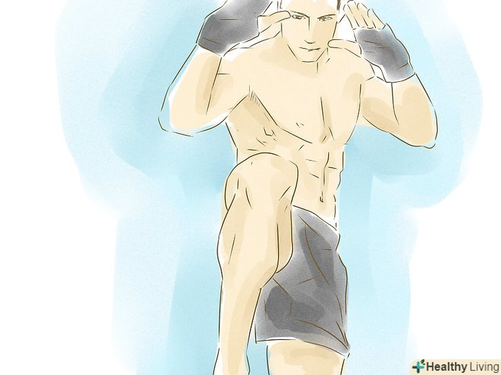 Використовуйте руки. ви можете досягти більшої сили удару, якщо перенесете праву руку (якщо ви б'єте правою ногою) вниз під час удару.- Але врахуйте, це робить вас більш вразливими до контратак, тому постарайтеся закрити обличчя і голову іншою рукою.