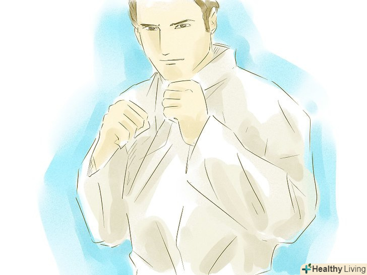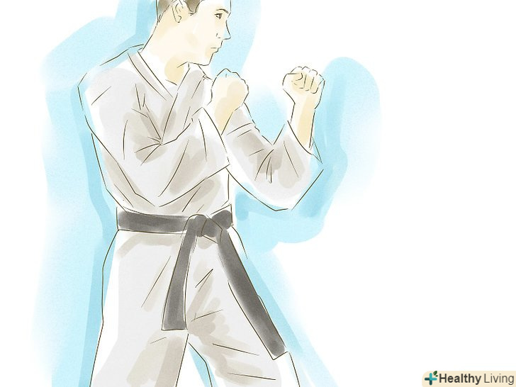 Прийміть захисну стійку. Якщо ви правша, поставте праву ногу вперед, а ліву назад. Щоб поставити блок, стисніть ваші кисті в кулак і підніміть їх приблизно на рівень вух, але не загороджуйте собі огляд.