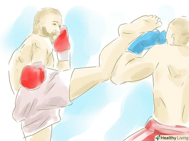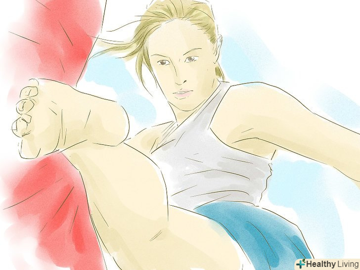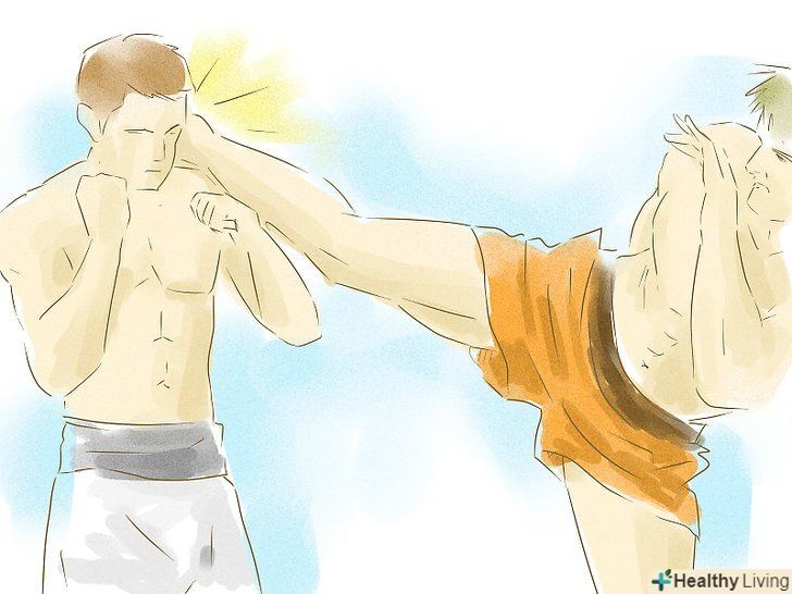 Нанесіть удар противнику. під час удару тримайте ногу прямо – пам'ятайте, ви б'єте великогомілкової кісткою.- Також пам'ятайте: ваша нога повинна завдати удару противнику як бейсбольна біта: збоку, а не прямо.