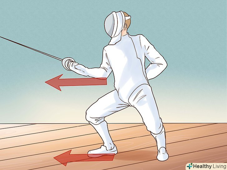 Освоюйте основні прийоми і маневри. робота ніг має велике значення в фехтуванні, тому так важливо відпрацьовувати плавні і легкі рухи. Основні позиції, які вам необхідно вивчити це: позиція En Garde, просте наступ і відступ. En Garde-це початкова позиція. Ви повинні повернутися тим боком, де у вас рука зі шпагою. Ступня повинна бути спрямована носком до супротивника, а носок іншої ноги повинен бути приблизно під кутом 90 градусів. При настанні першої рухається передня нога, а при відступі – задня. [6]- Намагайтеся утримувати рівновагу і рухатися якомога швидше.