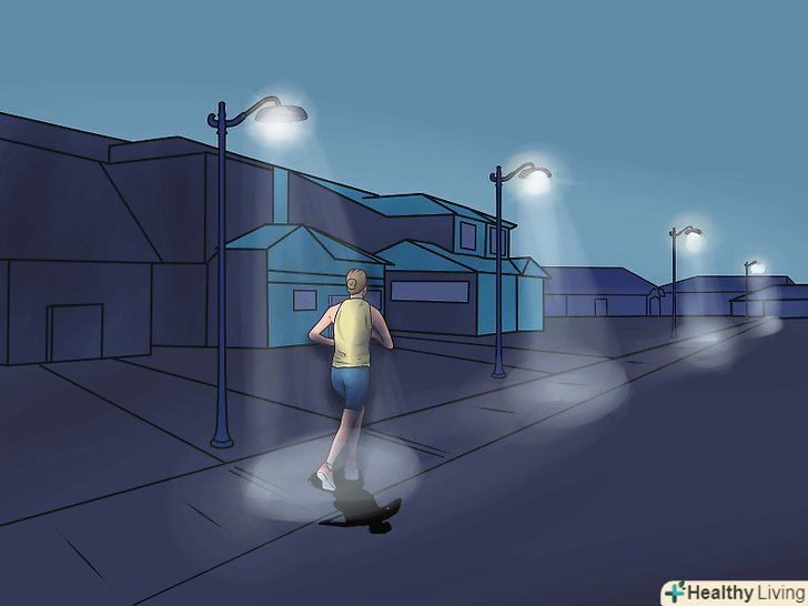 Вивчіть околиці. якщо ви збираєтеся тренуватися вечорами, бігайте по добре освітлених вулицях. Якщо з вами заговорив перехожий або у вас розв'язався шнурок, намагайтеся не зупинятися надовго. Повідомте сусіда по кімнаті або близьким, де ви будете бігати і коли чекати вашого повернення.- Якщо ви бігаєте вдень, стережіться автомобілів, велосипедистів і пішоходів. Завжди тримайте навколишню місцевість в полі зору і будьте готові в будь-яку мить змінити напрямок руху. Не чекайте, що кожен водій буде пропускати вас.