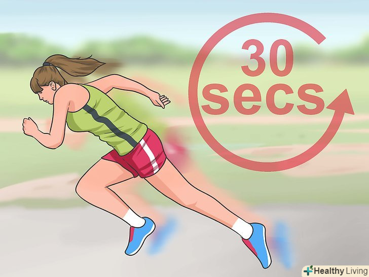 Біжіть на максимальній швидкості протягом 30 секунд. тривалість ривка вибирайте самі: хтось ставить перед собою завдання пробігти певну відстань, а хтось орієнтується на час. Так чи інакше, один забіг повинен тривати не більше 30 секунд.- Спринт відноситься до інтервальних тренувань. Це означає, що періоди активності змінюються перервами на відпочинок. Після кожної пробіжки робіть хвилинну паузу. Відпочивайте, стоячи на ногах або пересуваючись пішки. Період відпочинку повинен бути в два рази довше періоду активності.
