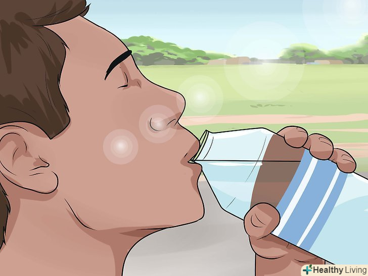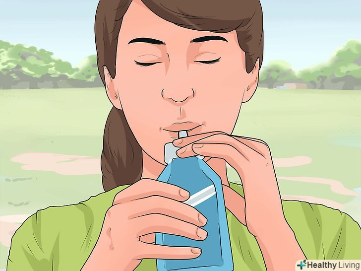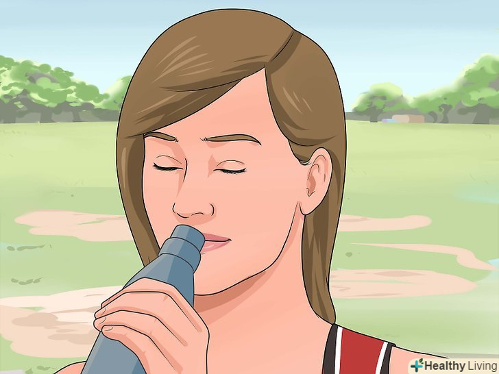 Зробіть ковток води. не пийте воду залпом. Якщо вам потрібно випити води в перервах між бігом, пийте маленькими ковтками. Не пийте багато води залпом, навіть якщо ви відчуваєте сильну спрагу, так як можуть виникнути гострі кольки в животі.- Вкрай важливо поповнювати запаси води в організмі, особливо якщо ви тренуєтеся в жаркий день. Зневоднення може викликати запаморочення і непритомність. Якщо ви не збираєтеся пити воду під час тренування, обов'язково пийте воду до і після неї.
