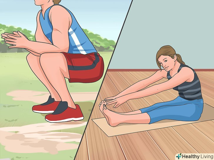 Виконуйте вправи для розтяжки м'язів після пробіжки. розтягуйте всі м'язи, приділяючи особливу увагу ногам. Зробіть розтяжку литок, чотириголового м'яза, підколінного сухожилля і м'язів торса. Дихайте повільно і глибоко. Фокусуйтеся на кожному м'язі під час розтяжки.- Розтягування м'язів сприяє їх розслабленню і знижує ймовірність виникнення м'язових судом. Обов'язково виконуйте ці вправи після інтенсивних тренувань.