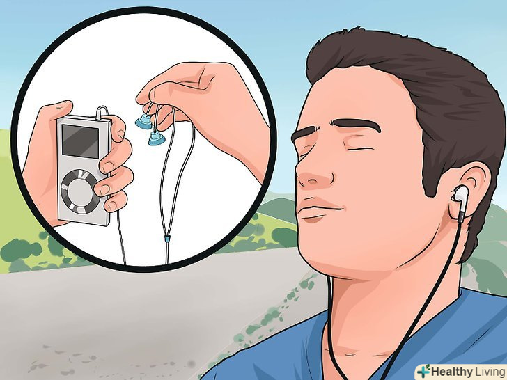 Слухайте музику під час пробіжки. біг під музику допомагає підтримувати бадьорість духу. Правда, деякі люди стверджують, що штучний ритм музичної доріжки заважає бігати згідно природному ритму тіла, а це, в свою чергу, може позначитися на ефективності тренування.- Якщо ви слухаєте музику під час бігу, користуйтеся навушниками-вкладишами. Вони невеликі за розміром і щільно сидять у вусі. Підключіть навушники до плеєра, смартфону або іншого цифрового пристрою. Щоб гаджет не випадав з кишені, прикріпіть його ремінцем або покладіть в чохол, який кріпиться до вашої екіпіровці. Також можна просто тримати його в руках.