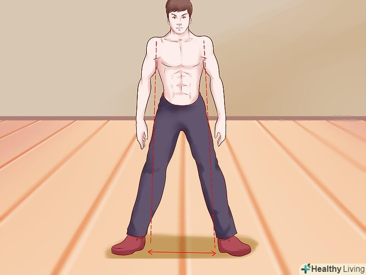 Займіть правильну позицію. Ноги розставте трохи ширше плечей. Шкарпетки дивляться вперед. Можете трохи розгорнути їх в стійку шкарпетки нарізно, результат буде той же.
