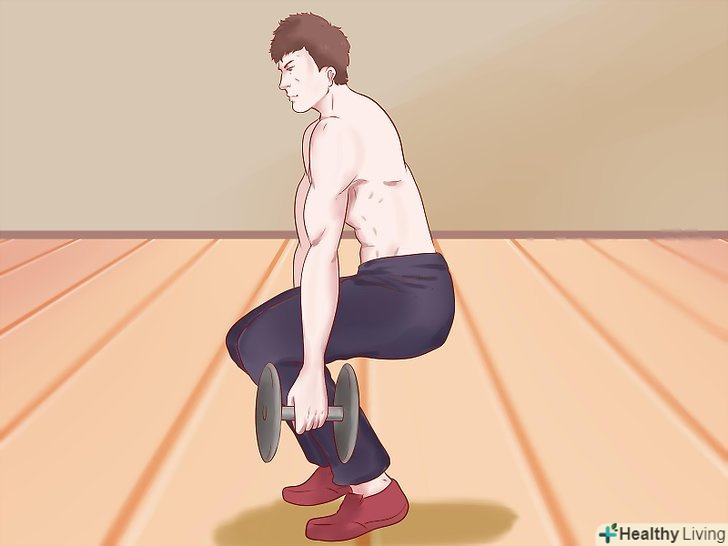 Присядьте і візьміть гантелі. виконуємо присед з рівною спиною. Перевірте, щоб плечі починали рух з рівня вух. Голова повинна весь час залишатися на одній лінії зі спиною, хоча, якщо вам так буде легше, можете трохи підняти вгору підборіддя. Дивитися все одно потрібно тільки вперед. (Якщо ви подивитеся в іншу сторону, то можете автоматично повернути і голову, за якою потягнеться і спина.) Переконайтеся, що груди випрямлена.- Слідкуйте за тим, щоб п'яти не відривалися від підлоги, а плечі були злегка навпроти подушечок пальців ніг.