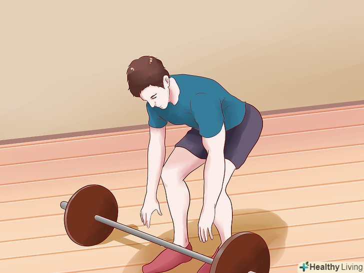 Беремо гриф. стояти потрібно досить близько до грифа, щоб нахилитися і взяти штангу. Хватка повинна бути на ширині плечей, а руки із зовнішнього боку колін. Руки повинні залишатися витягнутими.- Ви можете взяти гриф будь-яким зручним вам хватом. Рекомендую вам взяти змішаним хватом. Однією долонею берете гриф зверху, другий, знизу. Такий хват допоможе стабілізувати гриф і не дасть вам його впустити, якщо він раптом прокрутиться. Новачкам краще брати штангу змішаним хватом поки хватка остаточно не зміцніє.