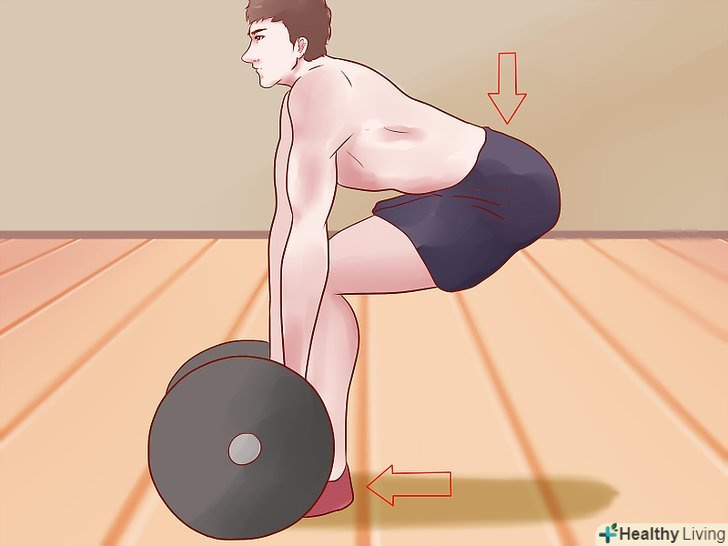 Присядьте, щоб опустити гантелі. роблячи присед, вам потрібно виконати рух таза назад і вниз. Намагайтеся не згинати коліна занадто сильно вперед, щоб вони не йшли далі шкарпеток. Весь час тримайте спину прямою, не сутультесь і не підтискайте куприк.- При нахилі, прес обов'язково повинен бути напружений і задіяний. Під час підйому штанги і присідання плечі потрібно відводити трохи назад і вниз.