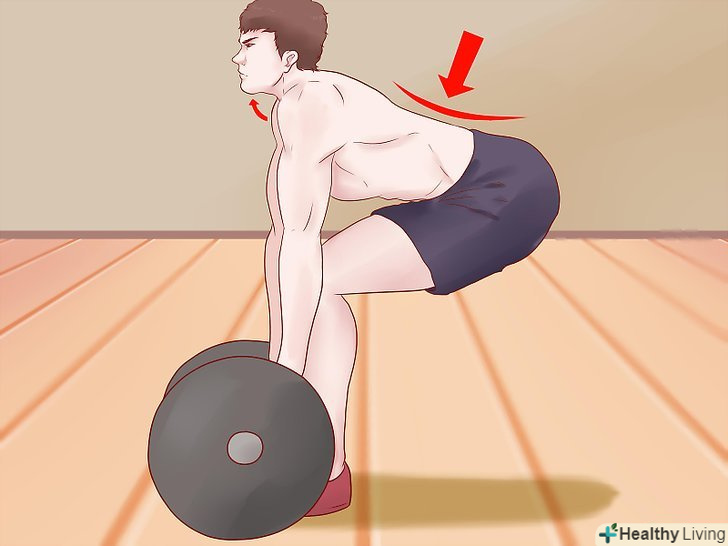 Тримайте все тіло в напрузі. м'язи Преса допомагають стабілізувати спину, коли ви піднімаєте гантелі. Перед тим як вийти у вертикальну стійку, випрямити коліна, а потім і таз. Тримайте гантелі на рівні таза з випрямленими в ліктях руками.- Стегна і плечі повинні починати і закінчувати рух вгору, вниз одночасно. Не потрібно притискати гантелі до себе під час підйому.