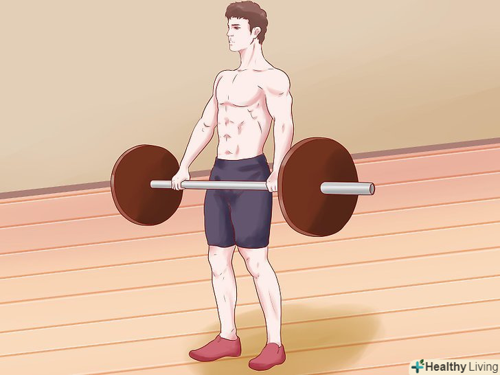 Піднімаємо штангу. Встаньте зі штангою, розправивши плечі. При цьому спина весь час повинна залишатися прямою. М'язи преса повинні бути напружені весь час під час підйому грифа. Піднімаючи гриф вгору, тримайте його ближче до себе. Уявіть, що ви відштовхуєтеся від підлоги. Поверніться у вихідну позицію-вертикальна стійка з опущеними плечима. Штанга повинна бути на рівні стегон, не потрібно намагатися підняти її вище.- Піднімайте штангу за допомогою стегон. В ногах більше сили, ніж в руках. Ноги також більше допомагають тримати рівновагу. Максимально навантажуючи стегна при відриві штанги, ви убезпечите себе від травм.
