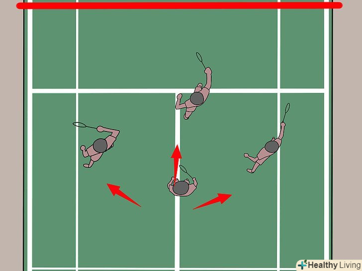Переконайтеся, що завжди повертаєтеся в позицію готовності після кожного удару. це означає, що ви повинні повернутися до вашої позиції, зберігати легкість в пальцях і бути готовим до наступного удару. Якщо ваш противник постійно тримає вас в одній стороні корту, утворюється хороша область, куди він може послати волан, щоб ви не могли його відбити, так що ви повинні повернутися в позицію готовності, як тільки зможете. [11]- Ця позиція означає, що ваші ноги повинні бути паралельні плечам і пальці повинні вказувати в сторону сітки.