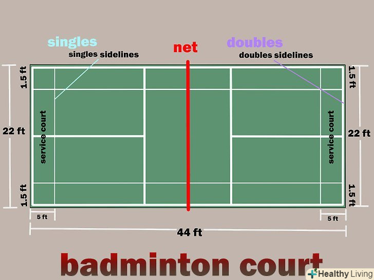 Познайомтеся з кортом. він має розміри 13,40 м в довжину і 6,70 в ширину. Якщо ви граєте самі, ви граєте на тій частині, яка 13,4 м в довжину, але ширина буде всього 6,1 м.сітка повинна бути розташована на півдорозі через суддівську лінію, на позначці 13,4 м, 1,5 м над землею. Коли ви граєте по дві людини, Додаткові до ігрової площі поля додаються 1,46 м на лівій і правій стороні майданчика (подвоюються бічні лінії). Ось що вам ще потрібно знати: [2] [3]- З кожного боку корту можна робити праву і ліву подачу. Одна команди може подавати тільки з одного боку корту до сервісної діагоналі. Таким чином, гравець з лівого боку корту повинен подавати зліва, гравець з правого боку корту-з правого.