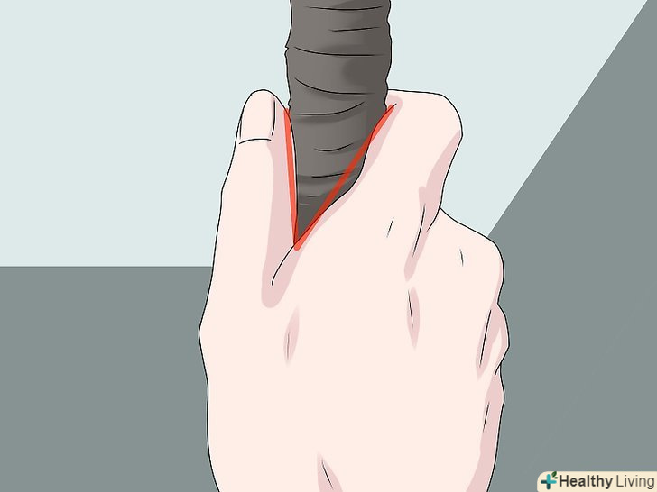 Освойте зчеплення. це те, як ви тримаєте ракетку, і це вплине на кожен удар, який ви будете робити. У грі є два основних захоплення, один для удару вперед і один для удару зліва. Ось те, що вам потрібно знати: [7]- Переднє зчеплення. Тримайте ракетку зі своєї не ігровий боку, ручкою до себе і лицьовою стороною ракетки перпендикулярно підлозі. Покладіть ручку в руку, як ніби ви з нею вітаєтеся. У вас повинна вийти V форма між великим і вказівним пальцями. Розслабте пальці руки для більшої гнучкості. Зменшіть зчеплення і перенесіть його ближче до рукоятки для більшого контролю ракетки, коли ви вдаряєте по волану від передньої площадки і середини корти.