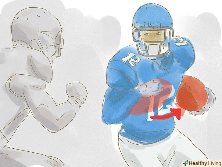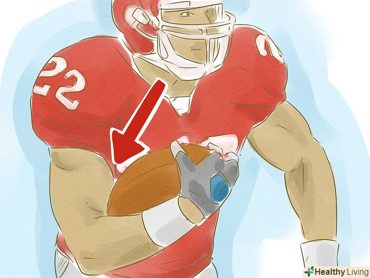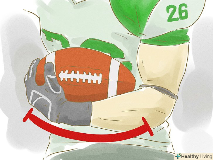 Вчіться перекидати м'яч в іншу руку. Американський футбол-божевільна гра, і вам потрібно вчитися підлаштовуватися до змін під час гри і до переміщень захисників. В цілому, вам необхідно нести м'яч з того боку, яка далі від захисників і ближче до бічної лінії, щоб якомога краще його захистити. Ваш корпус повинен знаходитися між захисником і м'ячем.- Тренуйтеся перекладати м'яч в іншу руку, але при цьому тримати його якомога міцніше і надійніше. М'яч повинен торкатися вашого торсу завжди, коли ви міняєте руки. Після цього накрийте його обома руками, ніби обіймаєте, перекладіть його в іншу руку і відведіть в сторону. Не жонглюйте м'ячем між рук.