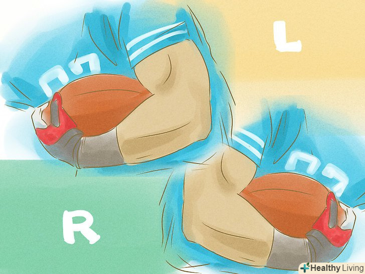 Тренуйтеся тримати м'яч в обох руках. хороші футболісти можуть однаково надійно перебігати з м'ячем в обох руках, так що дуже важливо витрачати стільки ж, якщо не більше, часу на те, щоб навчитися його тримати в недомінантній руці і затренувати навички, необхідні для гарної перебіжки з м'ячем.- Це особливо важливо для ранінг-беків, яким, в основному, слід брати м'яч в руку ближче до бічної лінії або в напрямку руху. Іншими словами, якщо ви біжите по лівій стороні, вам, як правило, необхідно тримати м'яч в лівій руці і подалі від захисників.